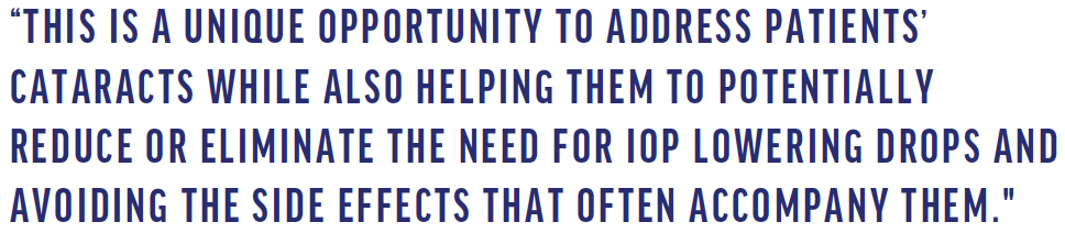 About 90% of my OMNI cases are combined with cataract surgery. This is a unique opportunity to address patients’ cataracts while also helping them to potentially reduce or eliminate the need for IOP lowering drops and avoiding the side effects that often accompany them. By working through the same clear corneal incision created for the cataract surgery and adding just a few additional operating steps, the surgeon is able to lower the patient’s IOP, rejuvenate functionality in the anatomical structures of outflow, and reduce or, in many cases, even eliminate the need for IOP-lowering drops for years to come.2