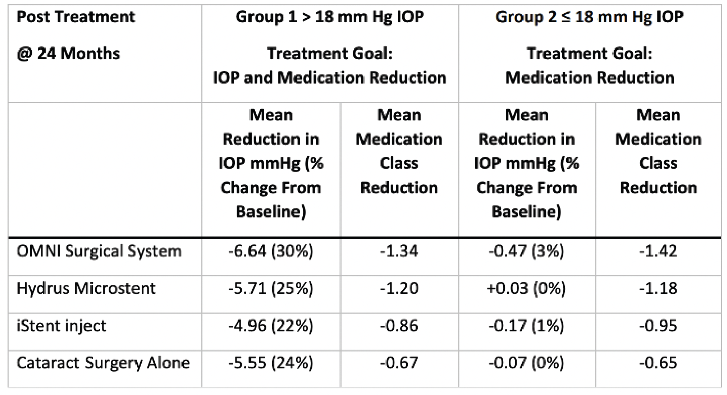 Similarly, earlier this year, Radcliffe et al published the results of a retrospective analysis of patients from the IRIS® Registry of patients with mostly moderate-to-severe primary open-angle glaucoma (POAG) who were treated with standalone canaloplasty and trabeculotomy using the OMNI Surgical System (n = 230 eyes in 196 patients).2 Mean IOP was 22.1 mm Hg at baseline and ranged from 15.1 to 16.7 mm Hg (P < 0.0001) at all postoperative time points. Mean glaucoma medications at baseline were 2.1 and ranged from 1.1 to 1.8 over 36 months. The authors concluded that canaloplasty and trabeculotomy performed as a standalone MIGS treatment provide clinically and statistically significant reductions in IOP out to 36 months. (For a summary of the original IRIS Registry Study,3 which was a real-world comparison of the results of three MIGS procedures with cataract surgery versus cataract surgery alone at 24 months, see the sidebar, The Iris Registry Study.)