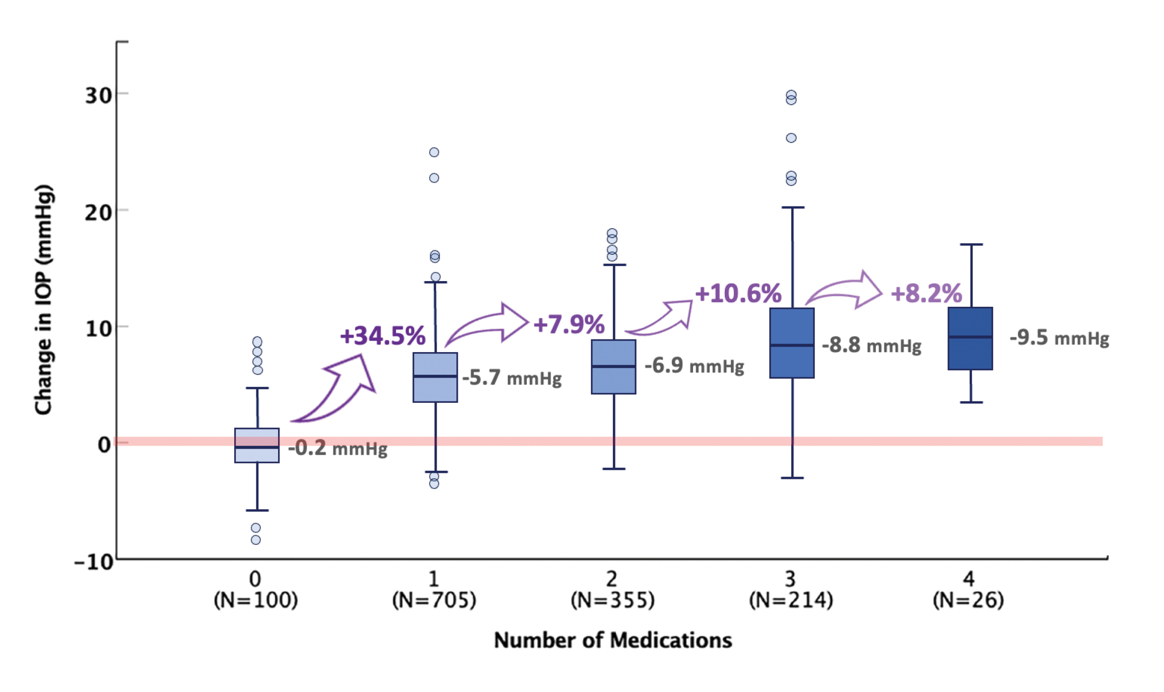 Figure 2. The first glaucoma medication is often the most impactful in reducing IOP. Subsequent medications have less effect. (Adapted from: Johnson TV et al. Am J Ophthalmol. 2020.7)
