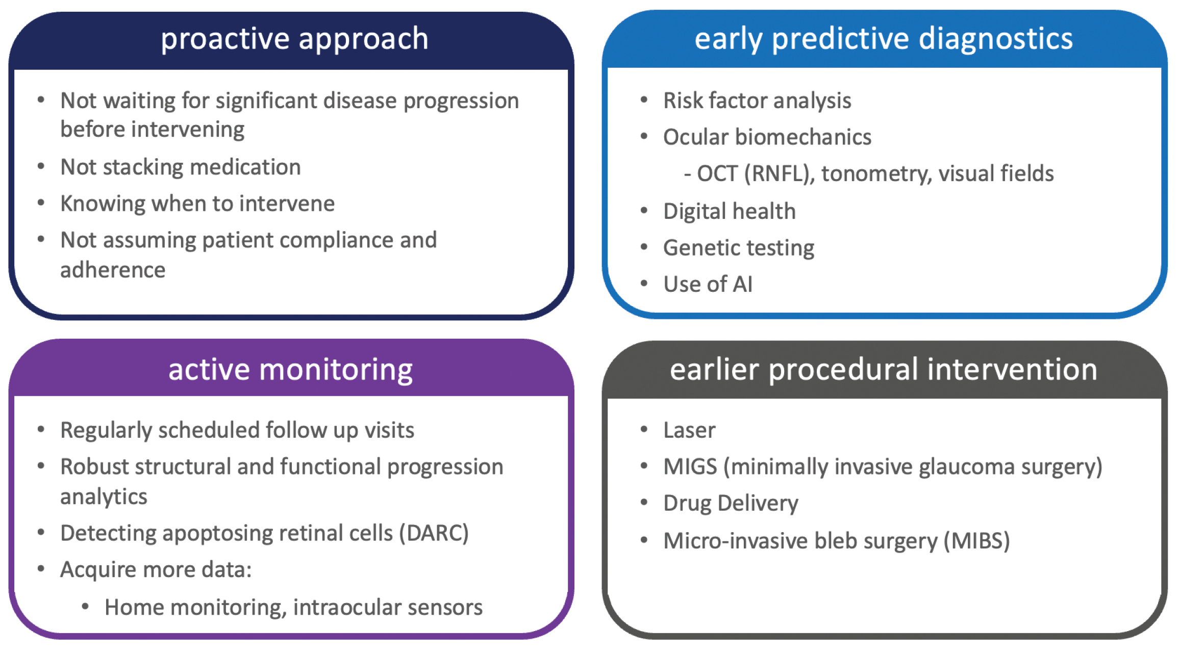 Some of our glaucoma colleagues, such as Iqbal “Ike” Ahmed, MD, in the United States, have been leading change in our field, especially in the surgical management of glaucoma. Dr. Ahmed describes interventional glaucoma as a proactive approach to treating the disease, in which clinicians regularly screen for glaucoma, actively monitor patients’ disease, and institute procedural interventions earlier in the treatment paradigm, with the goal of keeping patients’ vision stable over the long term whilst considering topical medications as supplemental only (Figure 3).