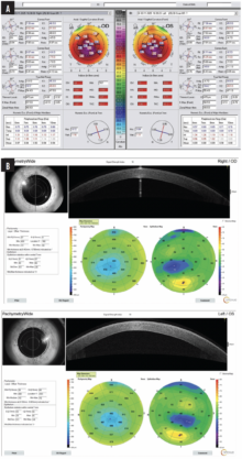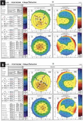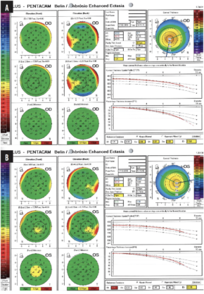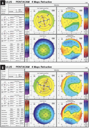 Figure 5. The 11-year-old daughter of a patient on whom Dr. Kanellopoulos performed CXL using the Athens protocol 10 years ago recently presented to his clinic with 20/50 UDVA OU and 20/20 CDVA OU. Measurements with the Pentacam revealed advanced keratoconus in both eyes (A). Anterior segment OCT showed progressive, advanced keratoconus and epithelial remodeling in each eye (B).