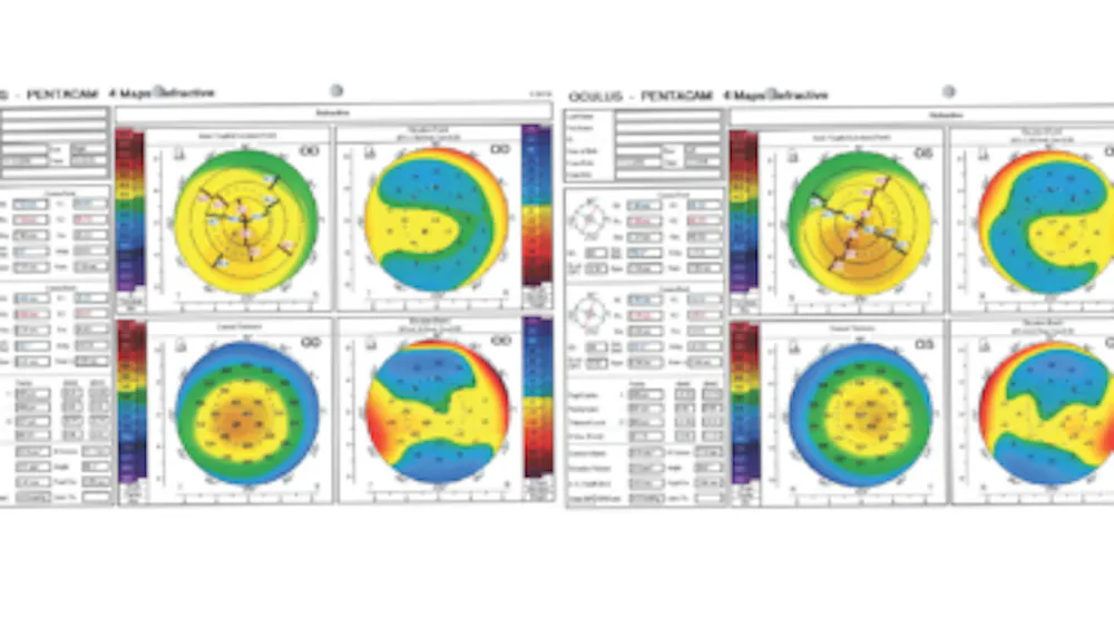 Figure 8. Dr. Trattler shares a case from 2021 involving a 15-year-old boy. The patient’s BCVA had decreased in the right eye, and significant keratoconus is evident. The left eye has 20/20 BCVA and no obvious asymmetry, although in retrospect, an early truncated bow tie is visible.