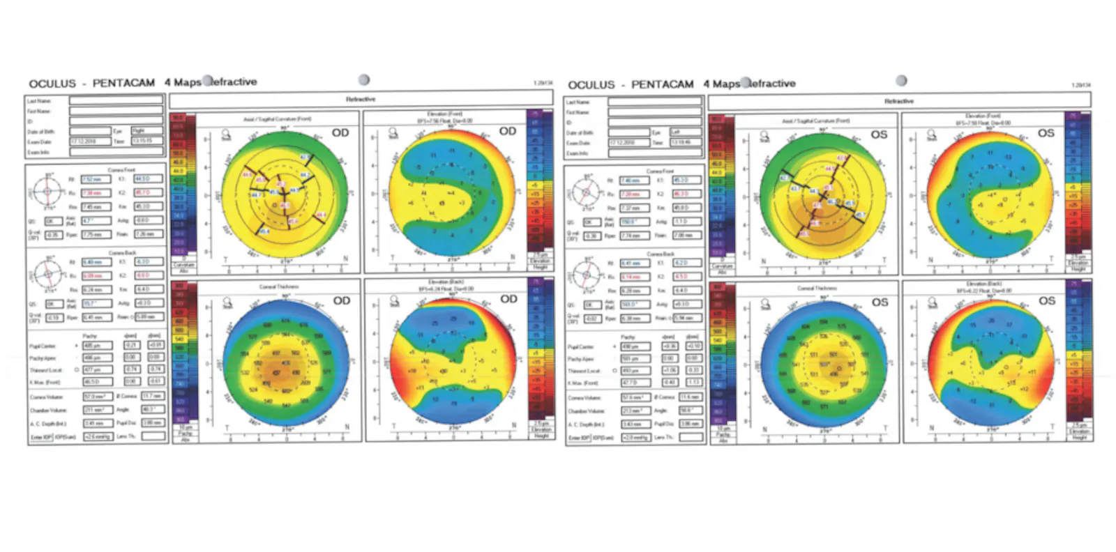 In early 2025, at 18 years of age, the patient presented for a follow-up visit with her mother. The patient had been diagnosed with celiac disease in the intervening years, and she was studying software engineering at a university. Her UDVA was 6/6 OU and 6/4.8 with both eyes open. Her corrected distance visual acuity (CDVA) was 6/4.8 with a manifest refraction of +0.50 -0.50 x 180º OD and 6/4.8 with a manifest refraction of +0.50 -0.50 x 160º OS. She no longer wore her glasses often. Topography was relatively regular (Figure 10), and pachymetry remained thin but stable. Updated diagnostic images are not provided, because no comparison data from 2018 are available.