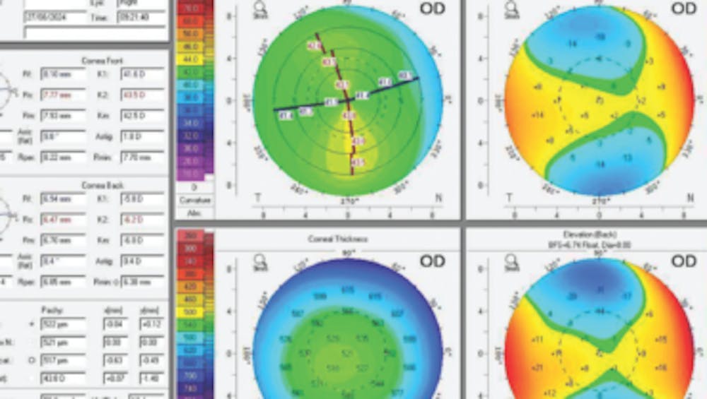 Epithelial mapping and tomography measurements of each eye would be obtained. Figure 1A shows mild asymmetric astigmatism with inferior steepening in the right eye. This may represent mild dry eye disease. Treatment with lifitegrast and preservative-free artificial tears would be initiated, and the patient would be asked to return in several weeks for repeat epithelial mapping and tomography. In addition, a cycloplegic refraction would be performed—especially important because she has anisometropia.