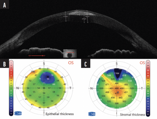 AS-OCT and oblique illumination with a slit lamp revealed faint haze localized to the site of the previous epithelial ingrowth that did not involve the visual axis (Figure 4B). Topography and epithelial thickness maps with the MS-39 (CSO Italia) had become more regular. Autorefraction was +0.75 -1.00 x 65º, and the patient’s UDVA was 6/6 OS.