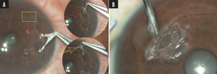 Figure 5. Piecemeal removal of an epithelial sheet. Rectangles indicate the inset areas of close-up, with each color-matched arrow showing incremental tissue removal (A). Epithelial cells are visible in necrotic liquid debris (B).