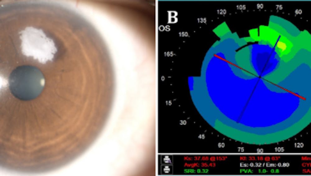 Upon examination, her uncorrected distance visual acuity (UDVA) is a blurry 20/30 OS. An autorefraction is +5.00 -5.75 x 66º OS. Her corrected distance visual acuity (CDVA) is 20/20 OS with a manifest refraction of -0.75 x 55º. A slit-lamp examination finds a 3 x 2-mm area of epithelial ingrowth superiorly between the 12 and 1 clock positions that approaches the pupil (Figure 1). The SMILE incision has a normal appearance, and there are no signs of a torn cap. Fluorescein staining produces no staining or tracking of dye.