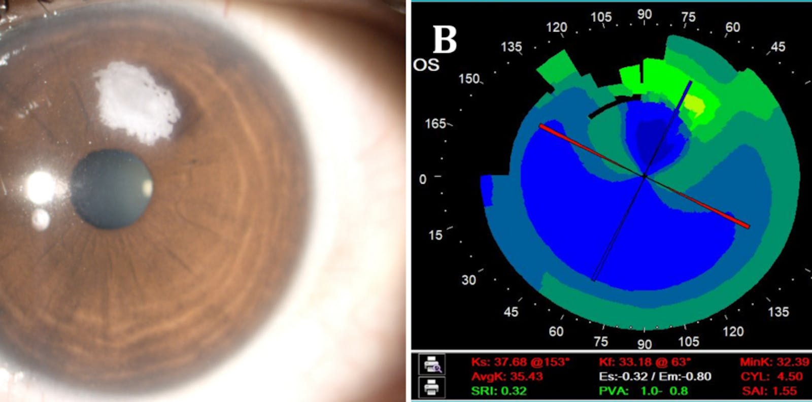 The patient underwent small-incision lenticule extraction (SMILE; Carl Zeiss Meditec) 1 year ago. The procedure treated a refractive error of -6.25 D OU. Surgical notes are not available.
