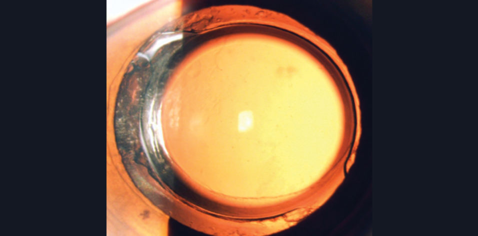 Figure 2. A patient who underwent cataract surgery in El Salvador 1.5 years earlier with Zepto capsulotomy. Note the slightly upturned capsular edge and the absence of PCO as well as the absence of fibrosis between the anterior and posterior capsules outside of the 6-mm optic.