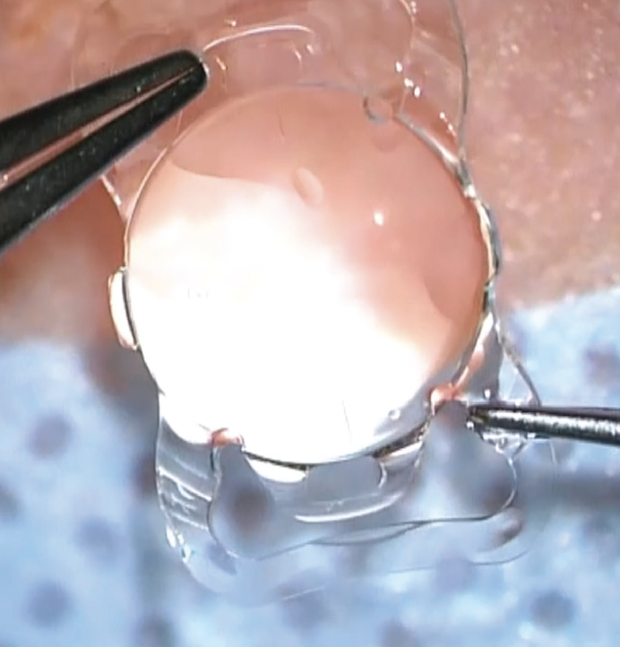 A third key step in astigmatic correction is that the toric IOL needs to stay where it is placed. Especially in myopic eyes, in which the capsular bag is often large, there’s a chance that a bag-fixated IOL will rotate. Therefore, I prefer to implant capsulorhexis-fixated lenses. Having used the FEMTIS® family of IOLs (Teleon Surgical) for the past few years, I have found several advantages to this design. These lenses stay exactly where I place them. Even when I implant a toric FEMTIS model (either the FEMTIS Comfort Toric or the FEMTIS Mplus Toric), I can rotate the lens in either direction inside the eye, using the alignment marks on the optic for guidance (Figure 1). It won’t tilt or become decentered postoperatively. Importantly, the technique to fixate the haptics is fast and easy; it becomes routine after a few cases.