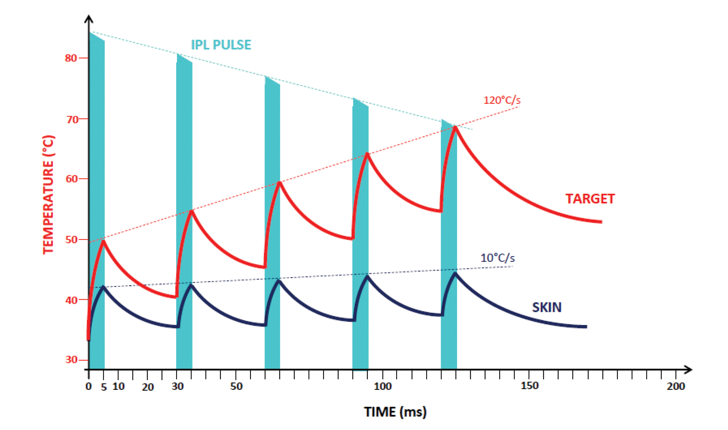 The C.STIM® represents next-generation IPL technology by integrating unique technical features to safely treat the skin around the eyes, which is the thinnest and most sensitive skin of the body. The handpiece of the C.STIM® device incorporates patented Stim-ULI™ (Uniform Light Intensity) technology, which ensures a perfectly even distribution of energy across the entire treatment window. The device delivers this energy in five regulated pulses (Figure 2). This “pulse train” technology is calibrated to give the skin thermal relaxation time (TRT) and prevent thermal damage, thereby minimizing any inflammatory reaction or burning on the skin (Figure 3). Combined, these features ensure a controlled energy accumulation for better results and a more comfortable treatment on the majority of skin types.