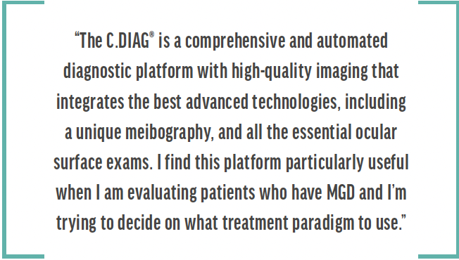 The C.DIAG® is a comprehensive and automated diagnostic platform with high-quality imaging that integrates the best advanced technologies, including a unique meibography, and all the essential ocular surface exams. I find this platform particularly useful when I am evaluating patients who have MGD and I’m trying to decide on what treatment paradigm to use.